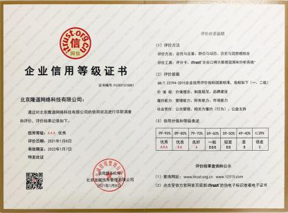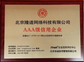 近日,隆道公司获得AAA级企业信用等级证书。“AAA企业信用等级”是企业信用评定的最高级别,第三方权威征信机构通过对隆道公司的企业综合素质、技术研发能力、管理水平、企业社会信誉、发展战略、品牌建设、财务分析等方面的深度考察和检验,最终评价结论为最高等级“AAA”级。此次在企业信用等级评价中获得AAA认证,是对隆道公司实力和信誉的高度认可,是隆道在健康发展过程中获得的又一重要里程碑,这一资质对企业后续发展具有深远的意义。
