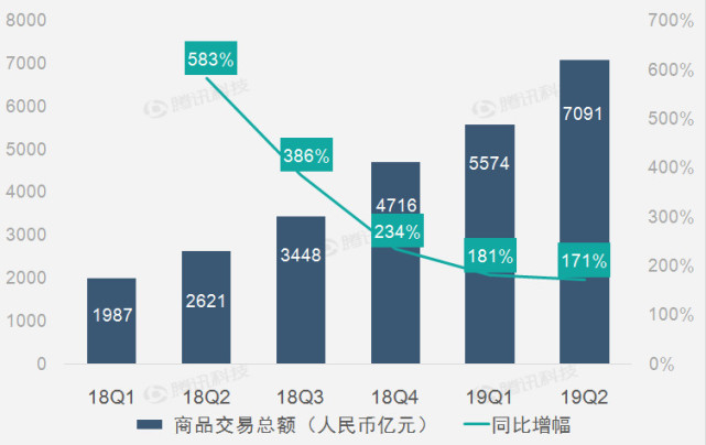拼多多截至2019年6月30日的年度商品交易总额为人民币7091亿元(约合1033亿美元),较截至2018年6月30日的年度商品交易总额人民币2621亿元增长171%。